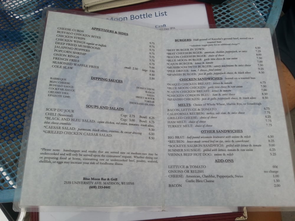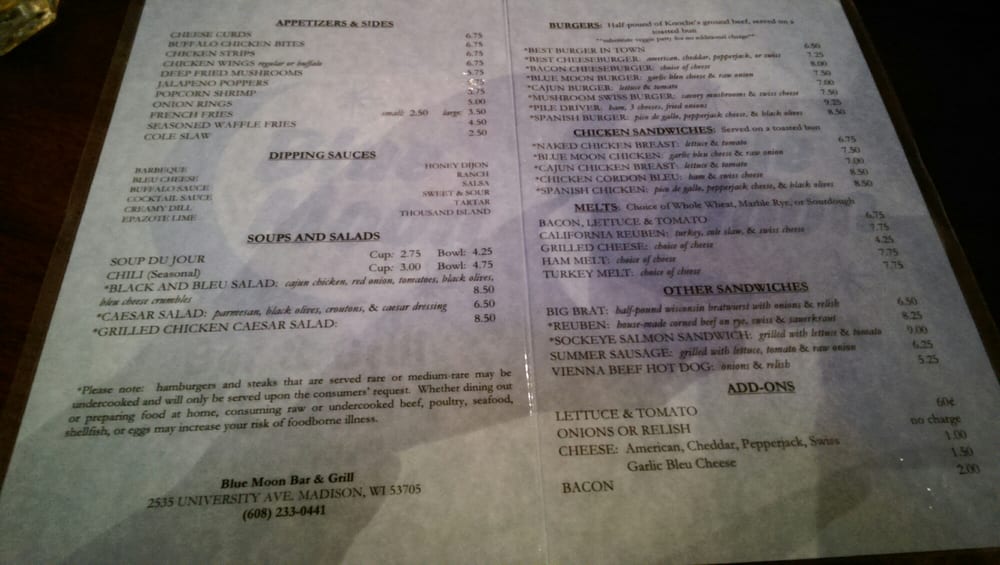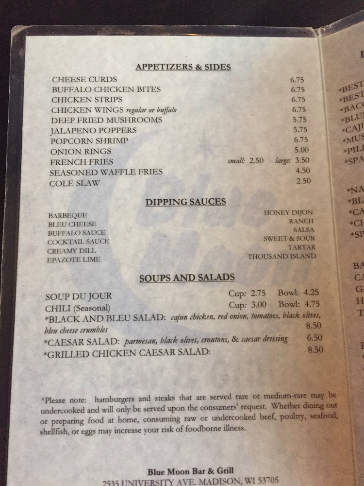 Introducing the menu at Blue Moon Bar and Grill, located in Madison, WI. This casual establishment offers a variety of appetizers and sides such as cheese curds, broccoli cheddar nuggets, and buffalo chicken bites. The dipping sauces include barbeque, blue cheese, and buffalo sauce. Enjoy soups and salads like the Black and Blue Salad or Caesar Salad. Customers rave about the waffle fries, burgers, and chicken tenders. The burger is cooked perfectly and the waffle fries are a favorite. The atmosphere is laid-back and great for watching games. With a diverse menu, friendly service, and a cozy neighborhood bar vibe, Blue Moon Bar and Grill is a must-visit spot for delicious comfort food.